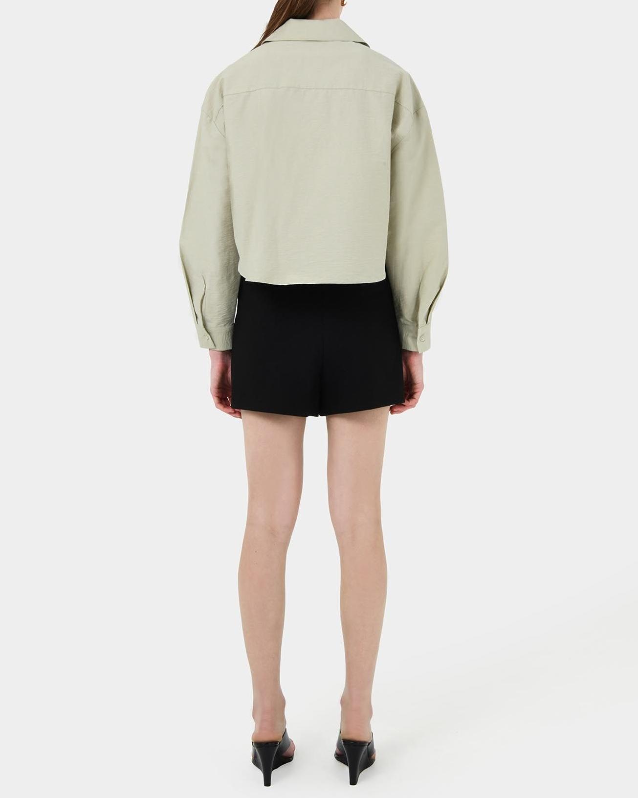 The Crop Pocket Shirt is a stylish and practical choice for everyday wear. Its cropped design and utility details make it great for casual or semi-formal outfits. It features two front pockets, a button-down front, and a collared neckline for a classic look. Pair it with your favorite high-waisted bottoms and sneakers or layer it over a fitted tank top for a relaxed style.