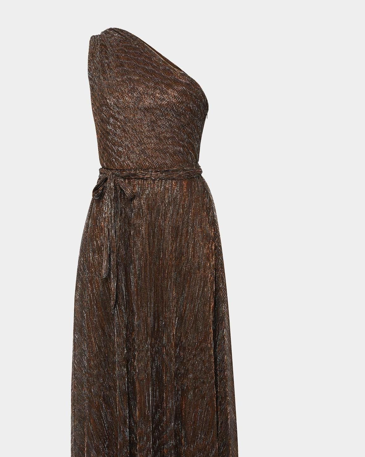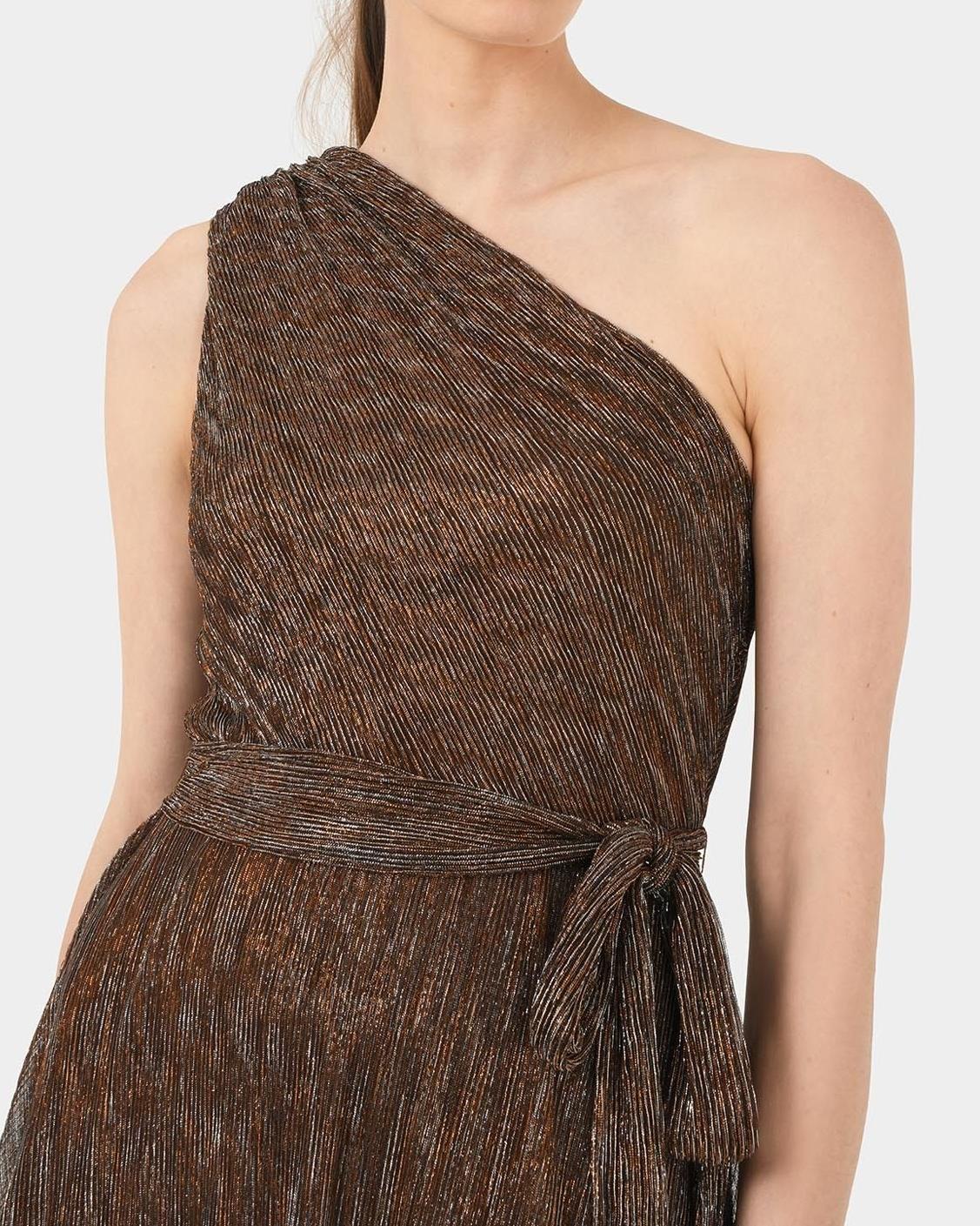 • Intricate one-shoulder design with soft, gathered plisse fabric