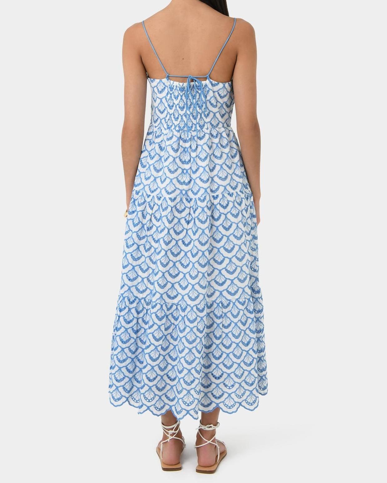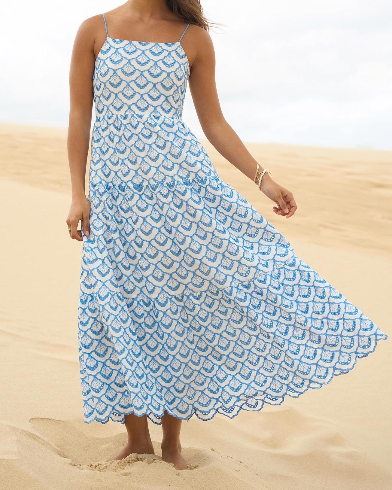 Embrace the summer with the Embroidery Maxi Dress. Featuring a blue-and-white embroidered pattern inspired by ocean waves, perfect for a fresh, summery vibe. Blending modern charm with a relaxed bohemian personality, this dress is your ultimate go-to for warm, sunny days or special evenings.