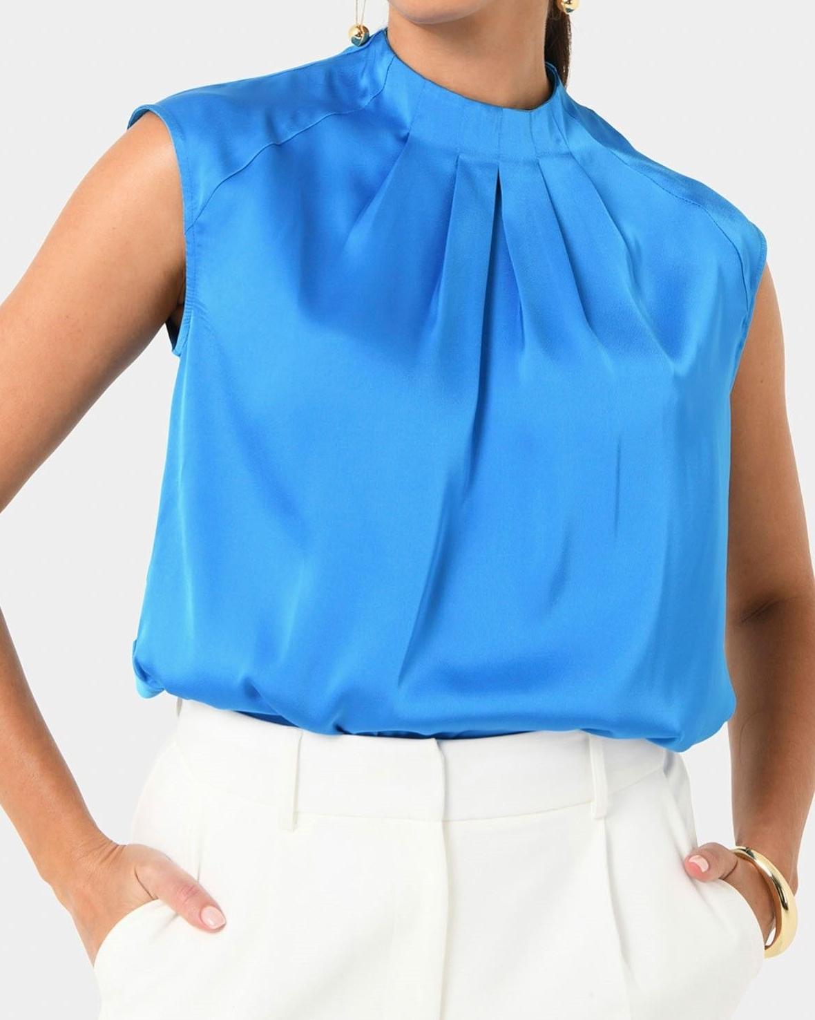 The Pleated Satin Top is a versatile wardrobe essential for anyone who values effortless style. Featuring a high neckline with subtle pleating, it creates a flattering silhouette. The delicate cap sleeves add a touch of femininity, while the relaxed silhouette pairs perfectly with high-waisted bottoms or skirts, offering a chic and modern look.