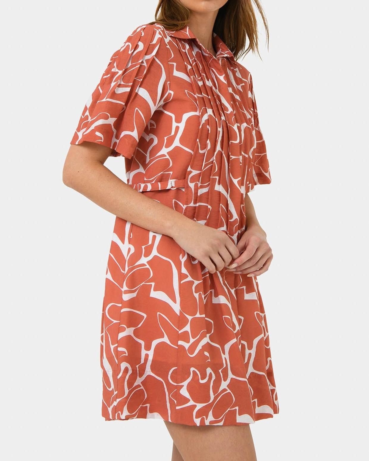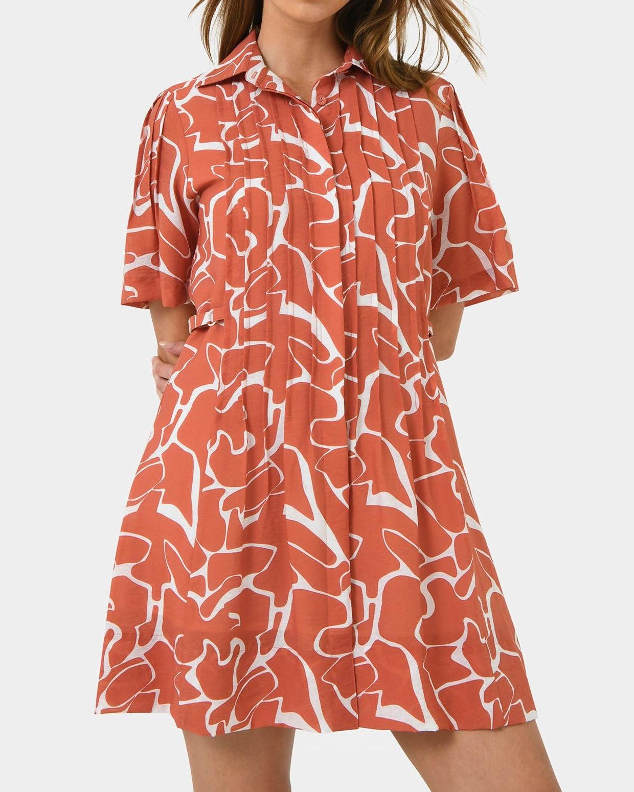 Make a statement with the Sunshine Pleated Dress. The flowing pleats add movement and grace, while the vibrant coral print brings a pop of color to your wardrobe. This dress is perfect for summer events or a sunny day out, offering a radiant and feminine look.